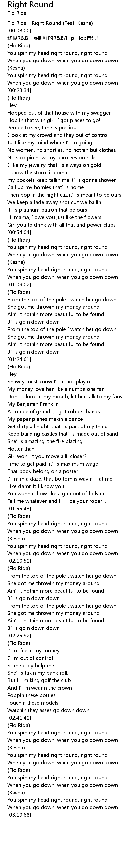| [00:00.00] | Flo Rida - Right Round (Feat. Kesha) |