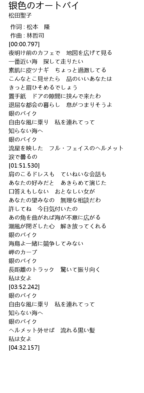 | [03:59.112] | 銀のバイク |