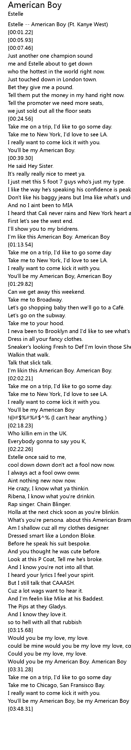| [01:57.88] | I'm likin this American Boy. American Boy. |