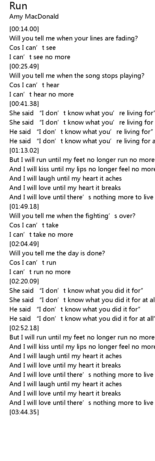 | [01:18.27] | But I will run until my feet no longer run no more |