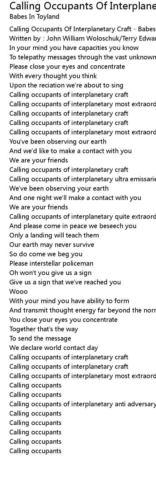 | [00:00.10] | Calling Occupants Of Interplanetary Craft Babes In Toyland |