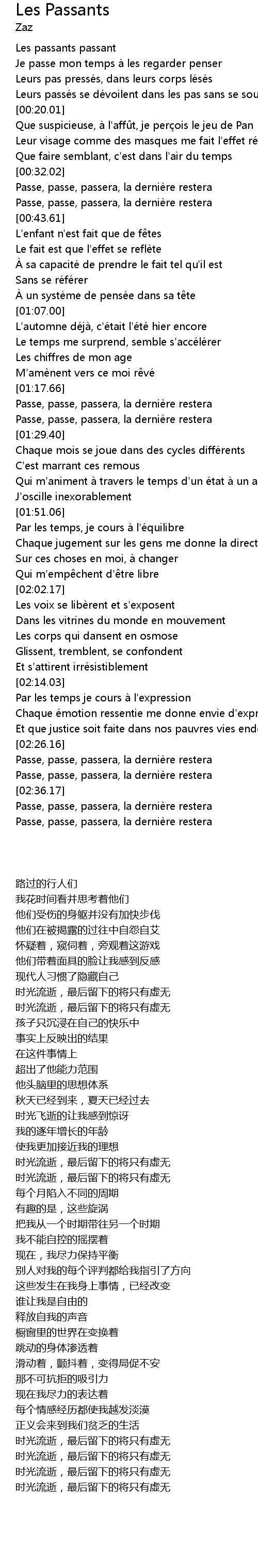| [00:33.97] | Passe, passe, passera, la dernie re restera |