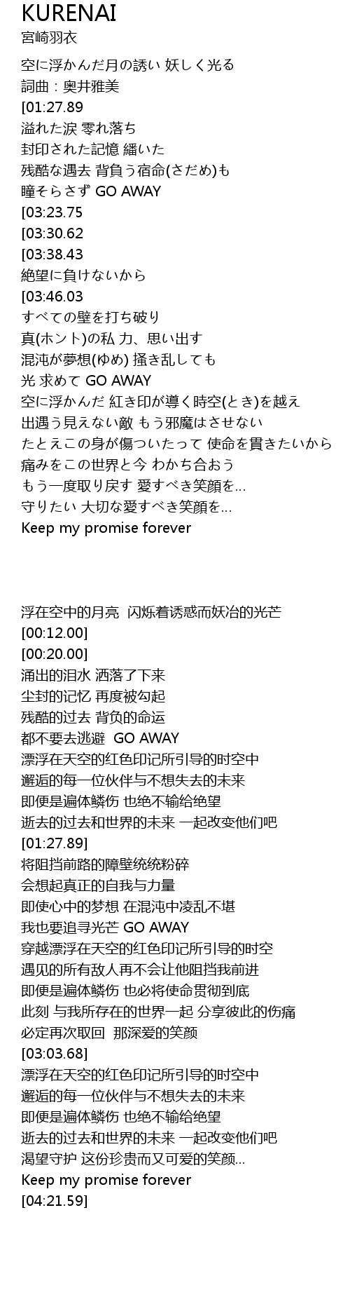 | [00:52.28][03:23.75] | 空に浮かんだ 紅き印が導く時空(とき)の中 |