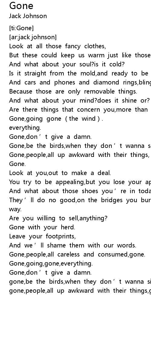 | [01:54.730] | gone, be the birds, when they don ' t wanna sing. |