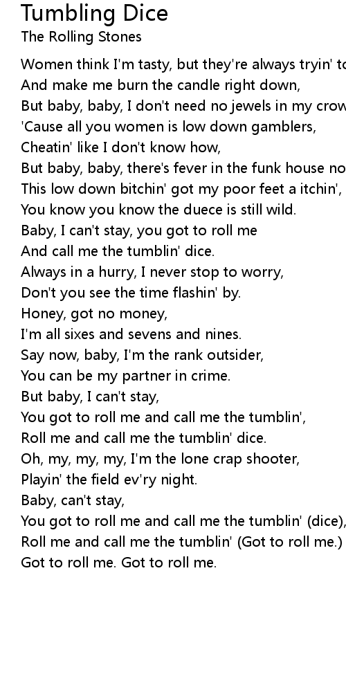 Roll me and call me the tumblin' (Got to roll me.) dice. |