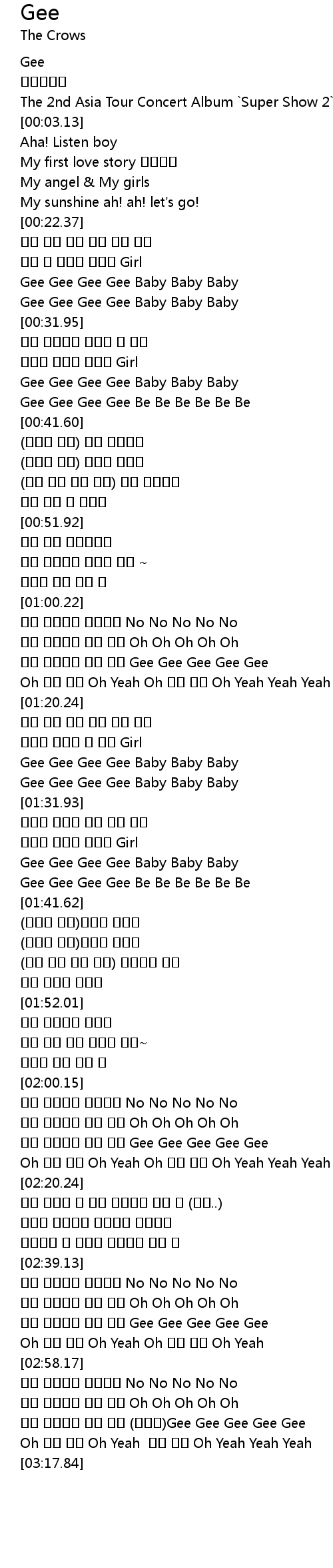 | [02:10.07] | 너무 짜릿짜릿 몸이 떨려 Gee Gee Gee Gee Gee |