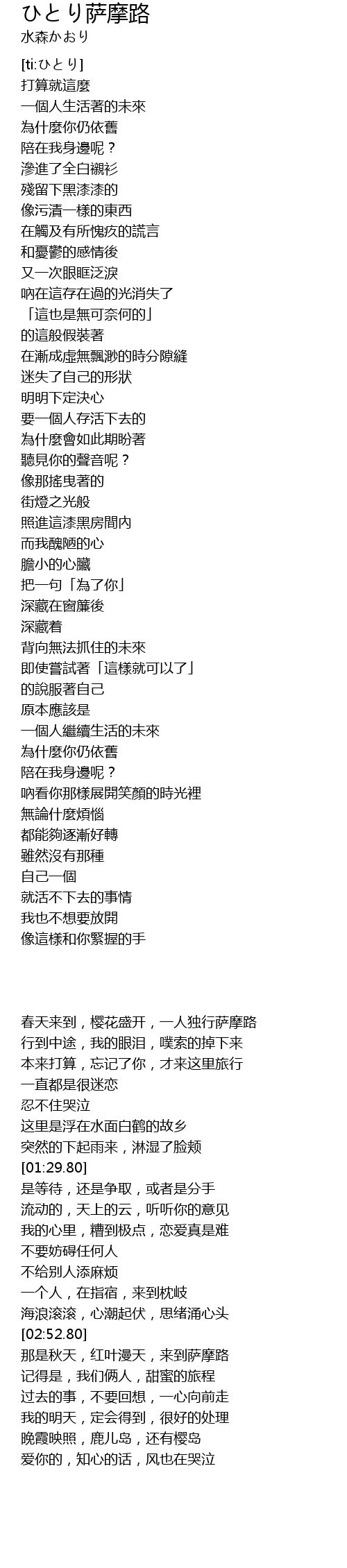 | [00:28.60] | 春天来到,樱花盛开,一人独行萨摩路 |