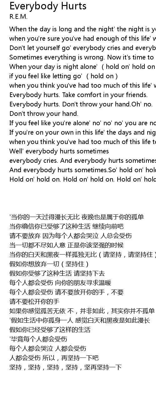 | [02:24.97] | Everybody hurts. Don' t throw your hand. Oh' no. |