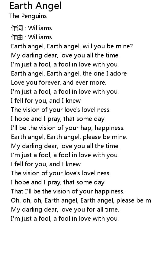 | [01:31.784] | Earth angel, Earth angel, please be mine. |
