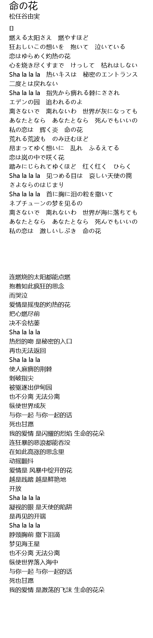 | 私の恋は 激しいしぶき 命の花 |