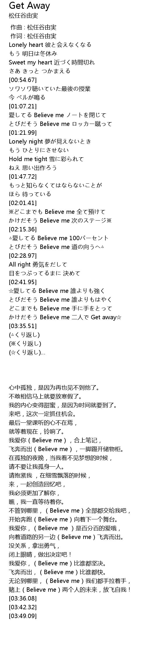 | [03:28.87] | かけだそう Believe me 二人で Get away☆ |