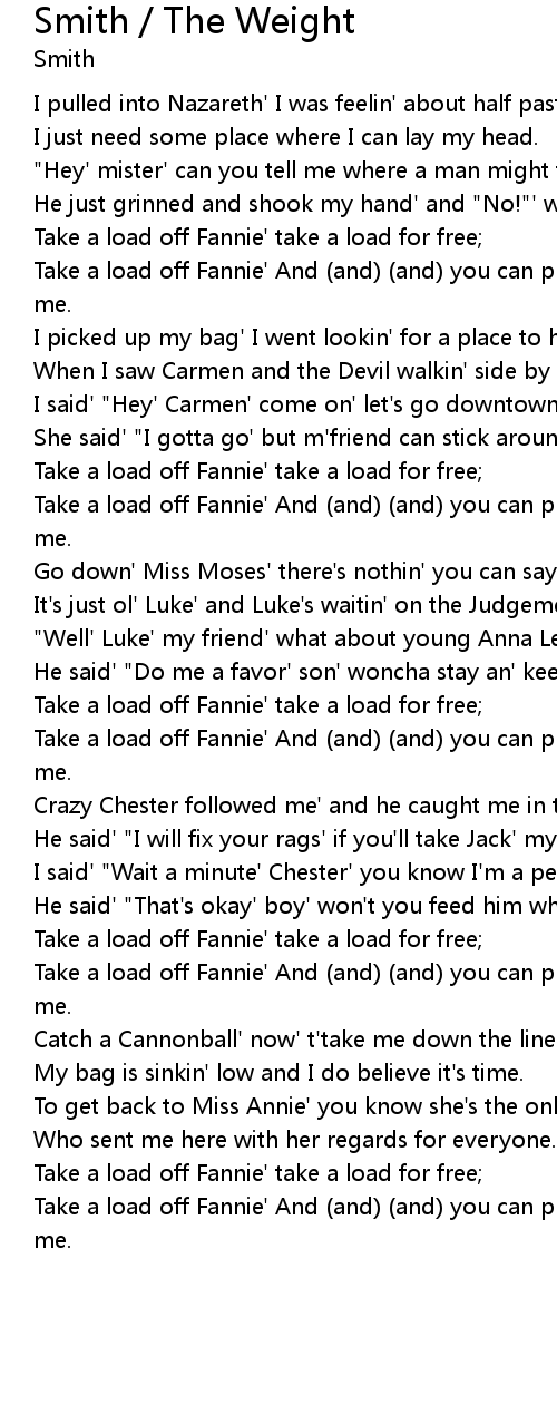 Take a load off Fannie' And (and) (and) you can put the load right on me. |