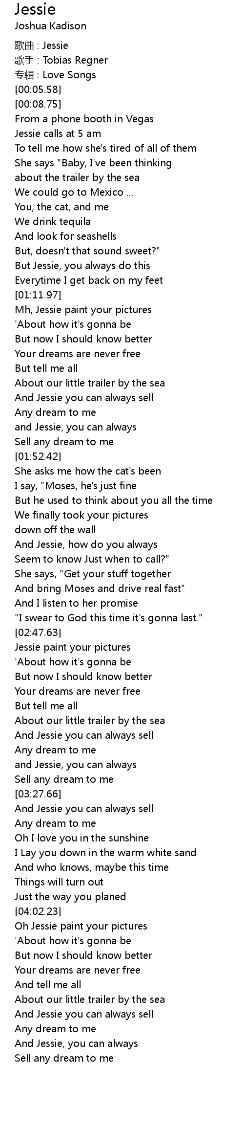 | [00:01.19] | 歌曲 : Jessie |