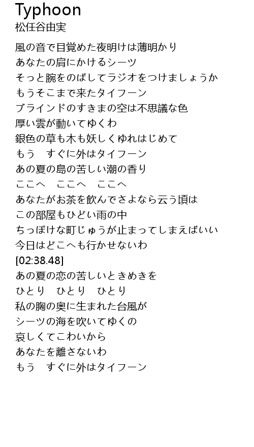 | [03:32.51] | 私の胸の奥に生まれた台風が |