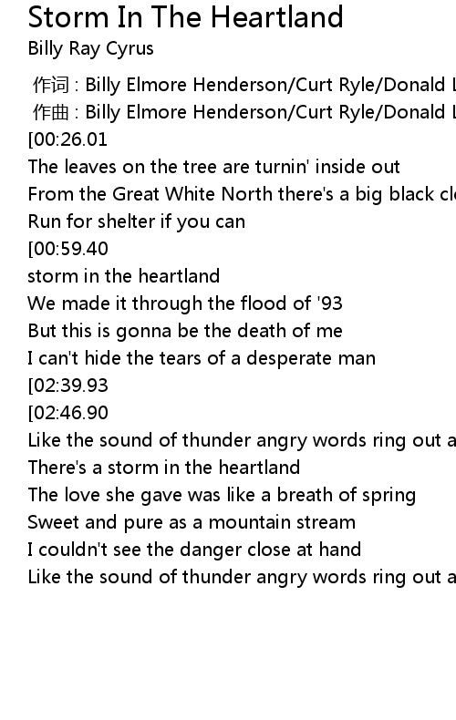 | [00:32.34][00:59.40][01:36.79][02:30.62][03:01.12][03:07.87][03:21.63] | There' s a storm in the heartland |