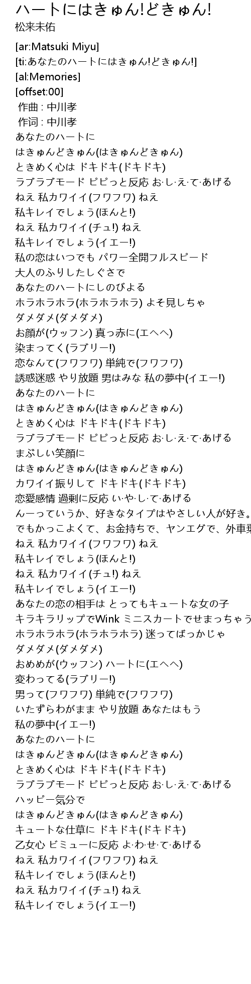 | [01:24.70] | あなたのハートに はきゅんどきゅん(はきゅんどきゅん) |