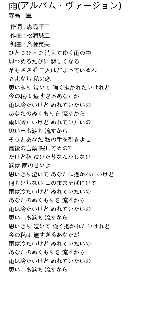 | [02:58.554] | 雨は冷たいけど ぬれていたいの |