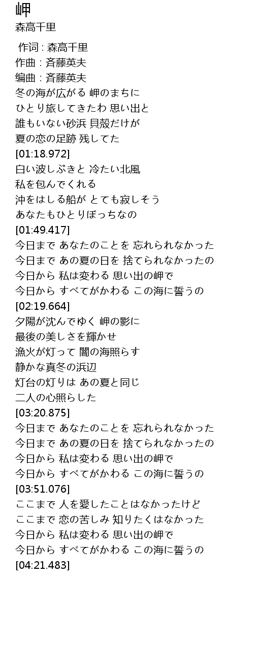 | [04:06.978] | 今日から 私は変わる 思い出の岬で |