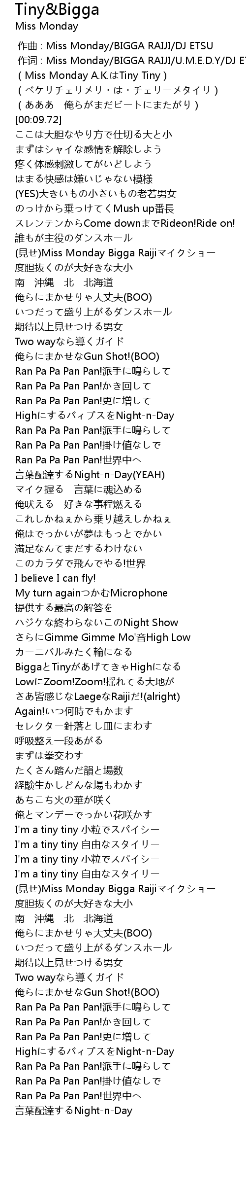 | [00:00.15] | 作词 : Miss Monday/BIGGA RAIJI/U.M.E.D.Y/DJ ETSU |