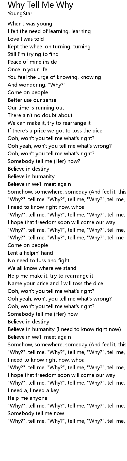| [02:00.30] | "Why?", tell me, "Why?", tell me, "Why?", tell me, "Why?", tell me, "Why?", tell me, "Why?", tell me, "Why?", tell me |