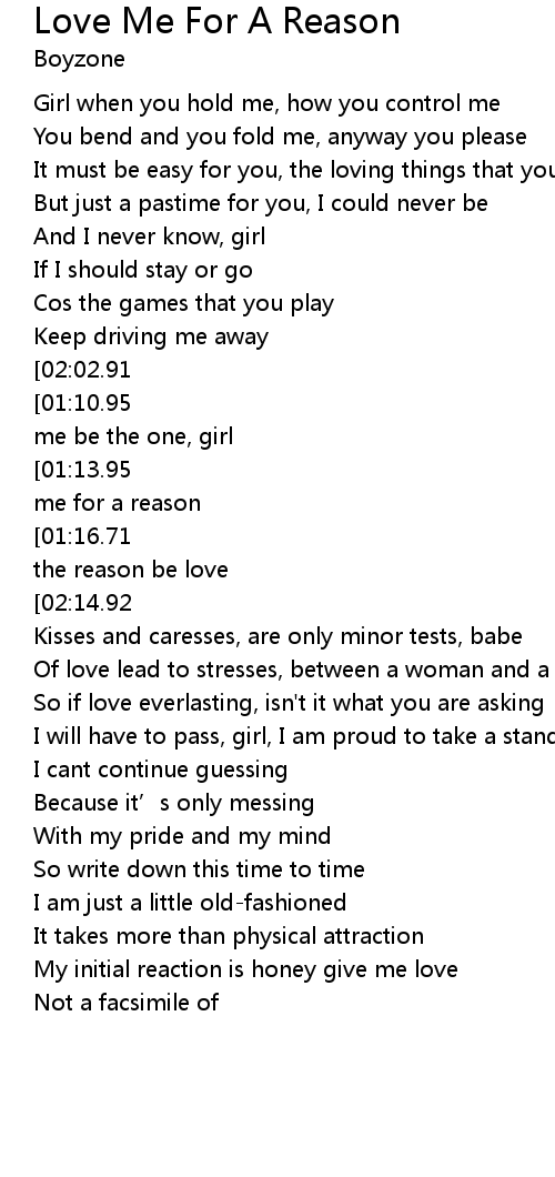 | [01:01.55][01:13.95][02:08.83][02:21.28][02:57.69][03:10.27][03:22.21][03:34.56] | Love me for a reason |