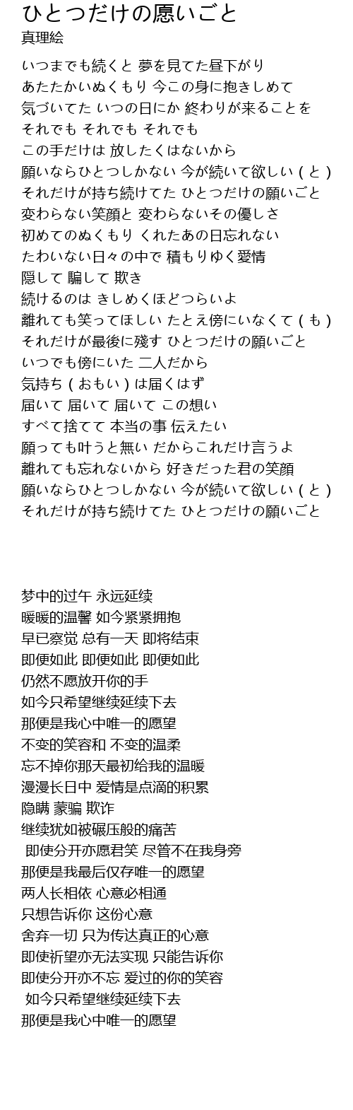 | [01:34.56] | それだけが持ち続けてた ひとつだけの願いごと |