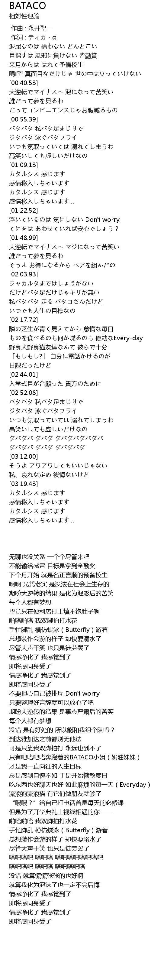 | [02:10.54] | 只有吧嗒吧嗒奔跑着的BATACO小姐(奶油妹妹) |