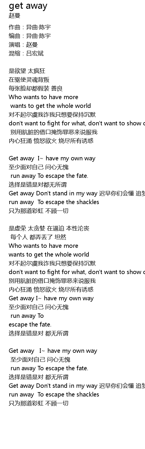 | Get away Don' t stand in my way chí zǎo nǐ men huì dǒng zhuī mèng wú zuì | |