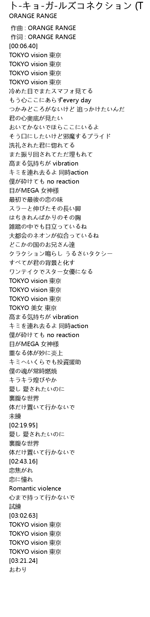 | [00:01.00] | 作词 : ORANGE RANGE |