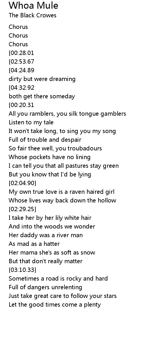 | [04:49.22][04:32.92][03:02.08][01:56.80][00:11.11] | Whoa mule, whoa mule, we' ll both get there someday |