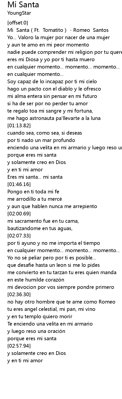 | [00:00.86] | Mi Santa(Ft. Tomatito) - Romeo Santos |
