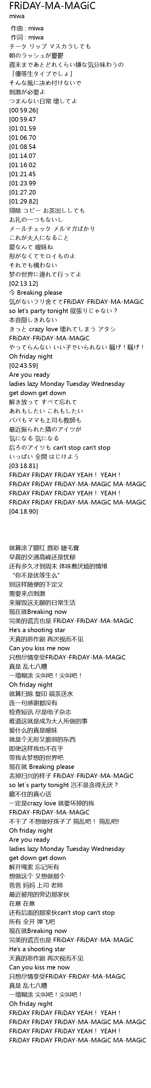 | [04:11.76] | FRiDAY FRiDAY FRiDAY-MA-MAGiC MA-MAGiC |