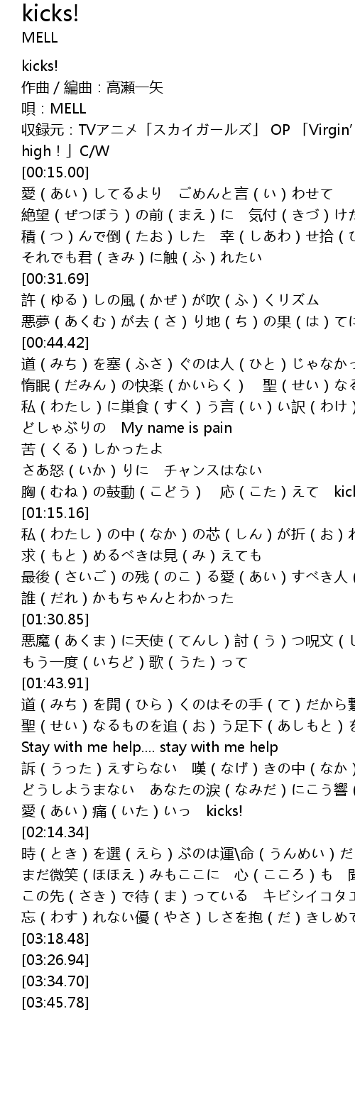 | [02:12.17] | 愛(あい)痛(いた)いっ kicks! |