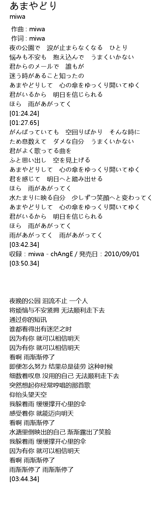 | [03:44.34] | 収録:miwa - chAngE/発売日:2010/09/01 |
