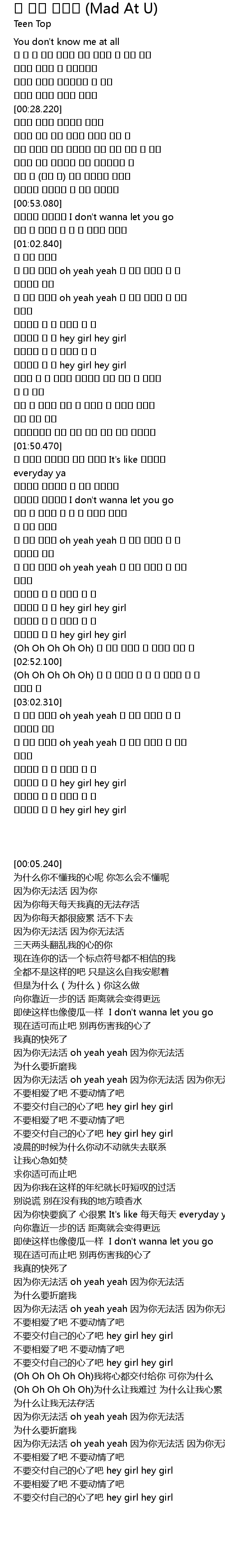 | [02:12.290] | 너 땜에 못살아 oh yeah yeah 너 땜에 못살아 왜 날 괴롭히는 건데 |