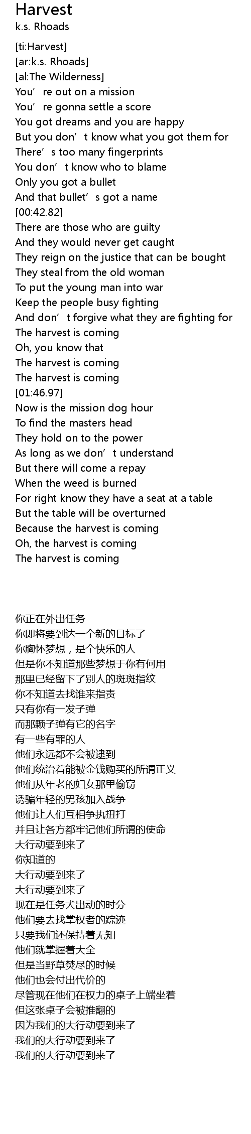 | [01:44.00] | The harvest is coming |