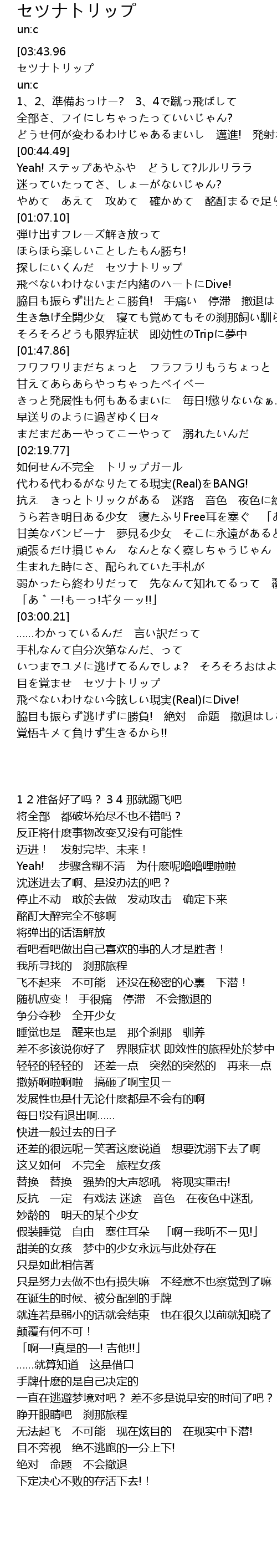 | [03:26.49] | 目を覚ませ セツナトリップ |