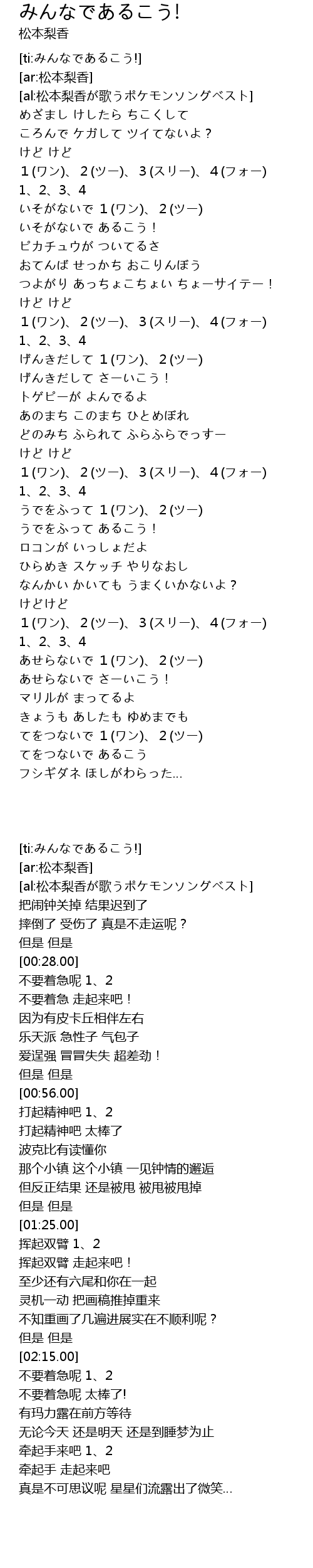 | [02:33.00] | てをつないで 1(ワン)、2(ツー) |