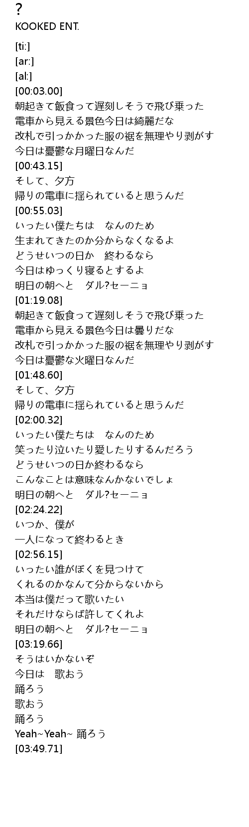 | [00:23.26] | 朝起きて飯食って遅刻しそうで飛び乗った |