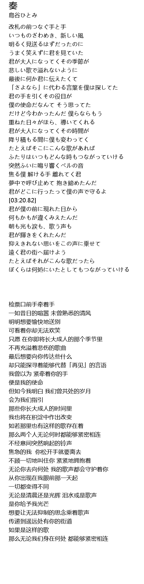 | [00:29.41] | 改札の前つなぐ手と手 |