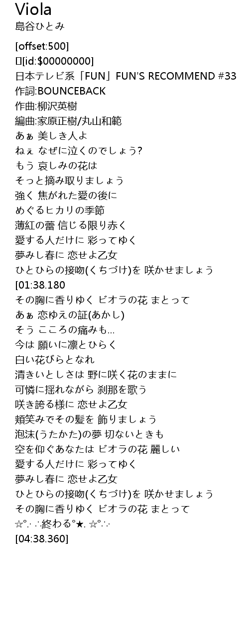| [04:13.730] | その胸に香りゆく ビオラの花 まとって |
