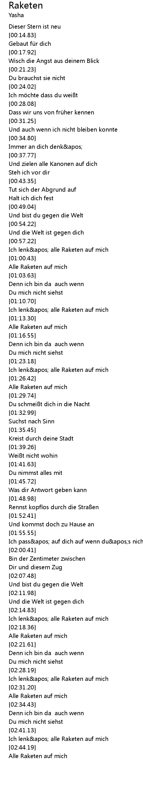 | [02:16.28] | Ich lenk' alle Raketen auf mich |