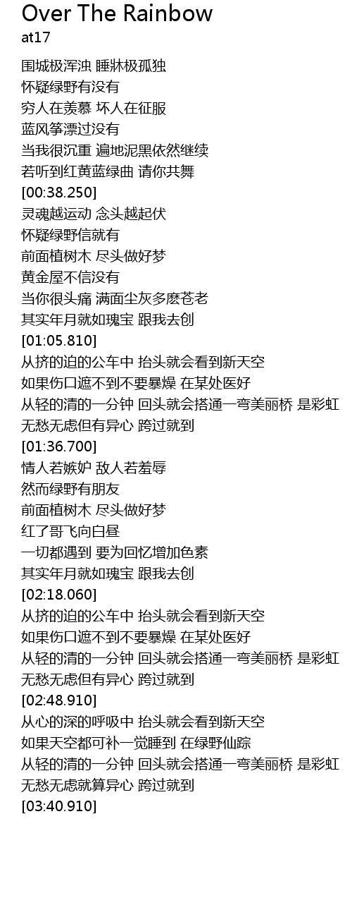 | [03:22.910] | 从轻的清的一分钟 回头就会搭通一弯美丽桥 是彩虹 |