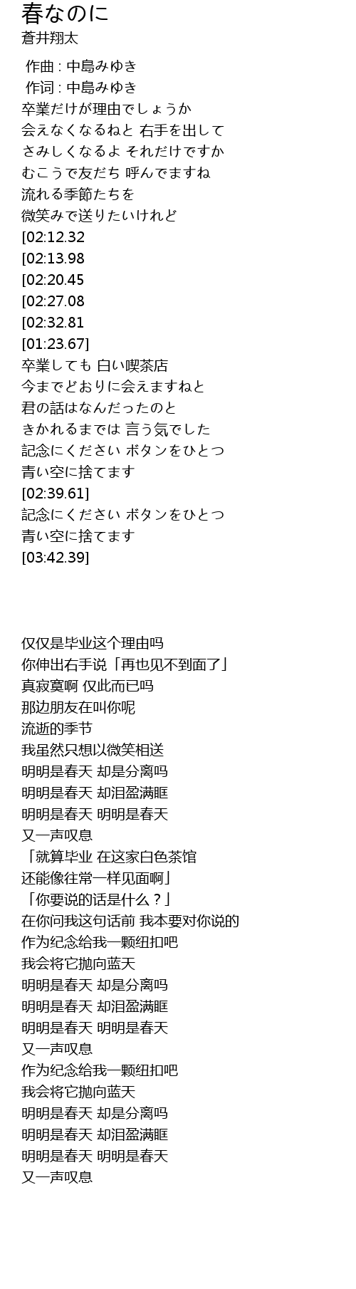 | [03:16.65][02:13.98][00:57.94] | 春なのに お別れですか |