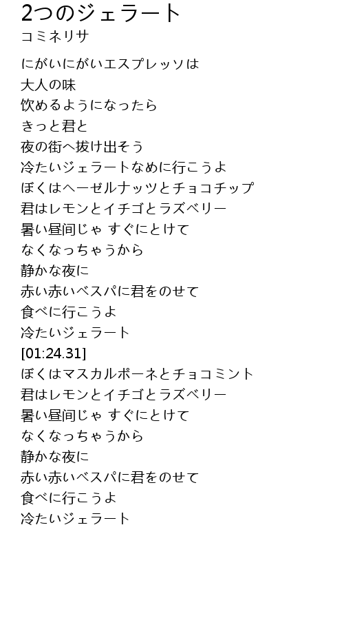 | [00:37.15] | 冷たいジェラートなめに行こうよ |