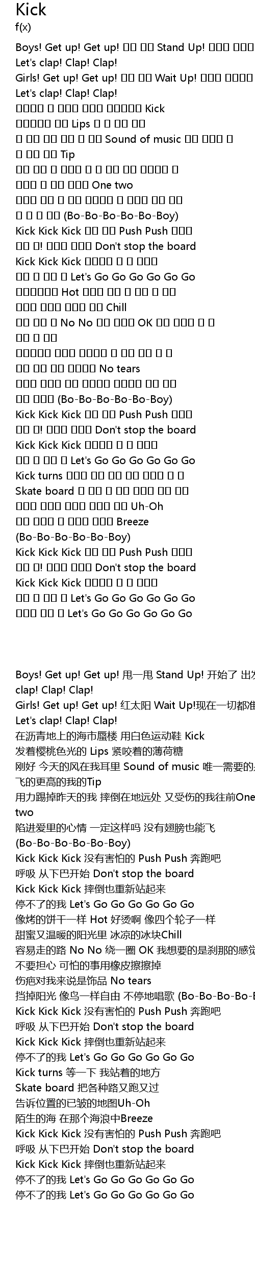 | [00:00.349] | Boys! Get up! Get up! 甩一甩 Stand Up! 开始了 出发了 Let's clap! Clap! Clap! |