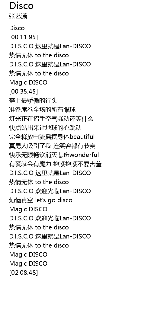 | [00:13.45] | D. I. S. C. O zhè lǐ jiù shì LanDISCO |