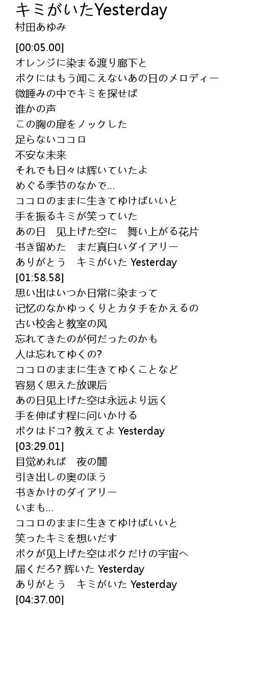 | [01:48.98] | ありがとう キミがいた Yesterday |