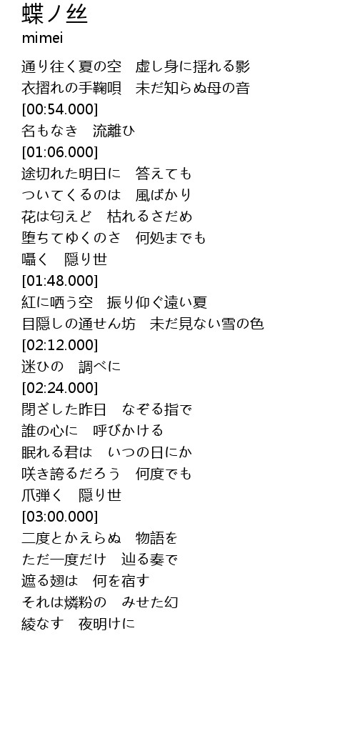 | [00:42.875] | 衣摺れの手鞠唄 未だ知らぬ母の音 |