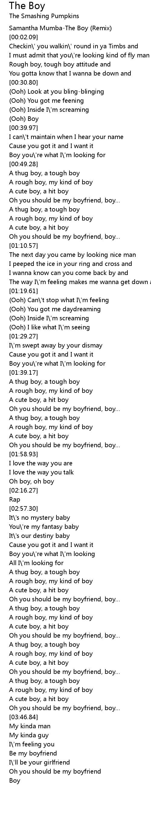 | [00:01.40] | Samantha Mumba-The Boy (Remix) |